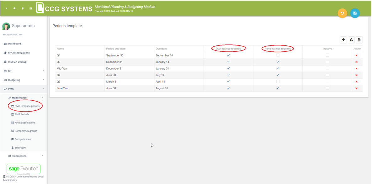 First, we will look at the PMS Periods Template. In the PMS Periods Template section, you can create a template for the different periods. When doing this, the panel and the responsible person will be prompted to leave a rating. You can set up whether or not the responsible person’s ratings and / or the panel ratings are required. Check the desired boxes behind the periods, and save your progress.