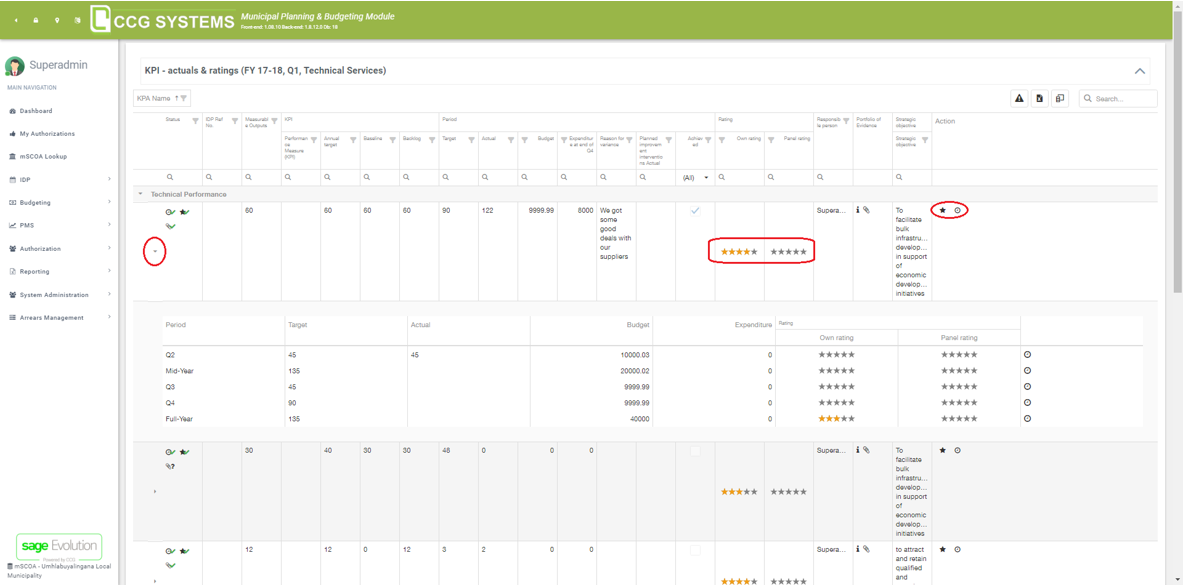 In the PMS actuals overview, you can keep track on how you are performing on your different KPI’s. This is also the place where both the responsible person and the panel can leave their rating (see “Rating” column). You will see the table at the bottom of the below screen, when you click on the arrow (red circle) of that specific KPI. Once opened, you will see detailed information for all periods.