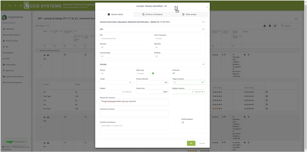 Portfolio of evidence: Documents that can act as proof for the achieved target and budget. Check the checkbox (called “POECompleted”) when these documents have been attached. This can be done on the second tab of this screen, called portfolio of evidence. The last tab, other actuals, will show all actuals for this KPI.