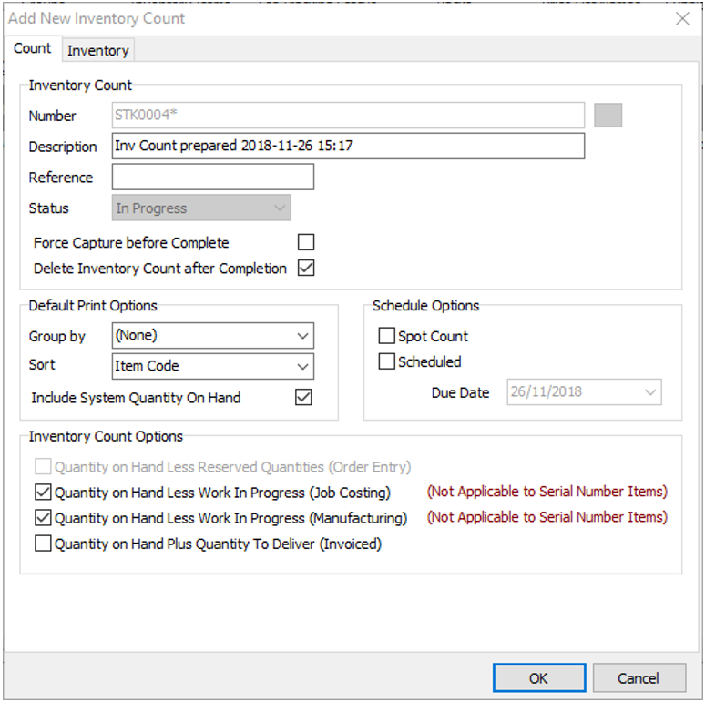 Quantity on Hand Less Work In Progress (Job Costing): Check this checkbox to exclude work in progress item quantities related to Job Cards when creating your Inventory Count.