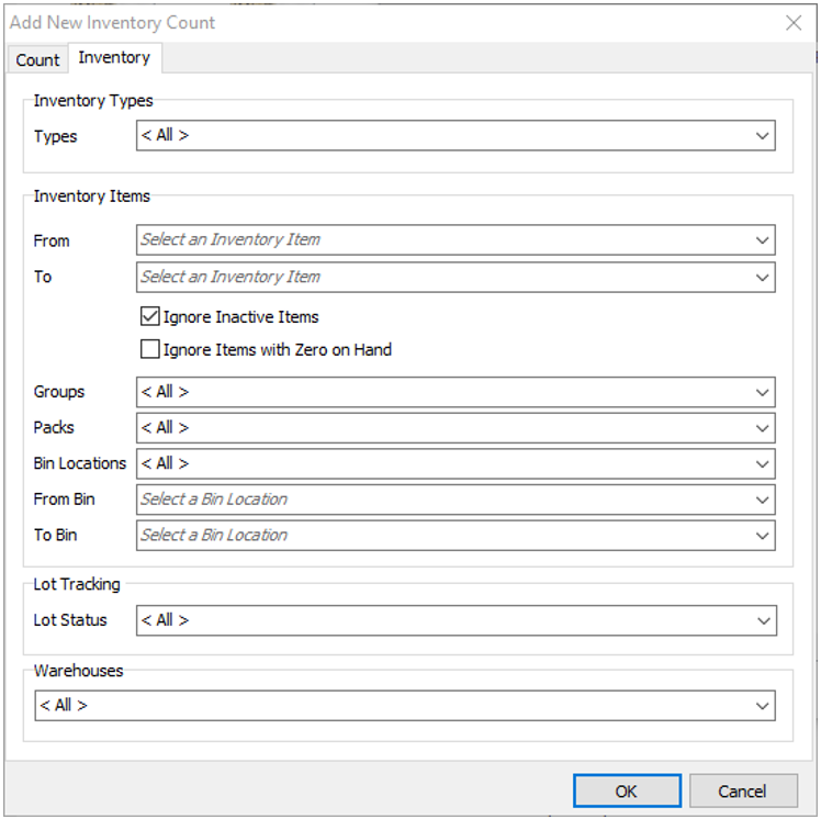 Ignore Inactive Items: If you stop using inventory items, you can mark them as inactive. Check this check box to leave inactive items off the count, and uncheck the check box to include inactive items. If you keep quantities of unused or obsolete items, you may want to include them.