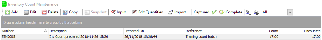 A window will popup showing all the active or processed inventory counts. From this window you can also create a new inventory count, which we will do now. See image below.