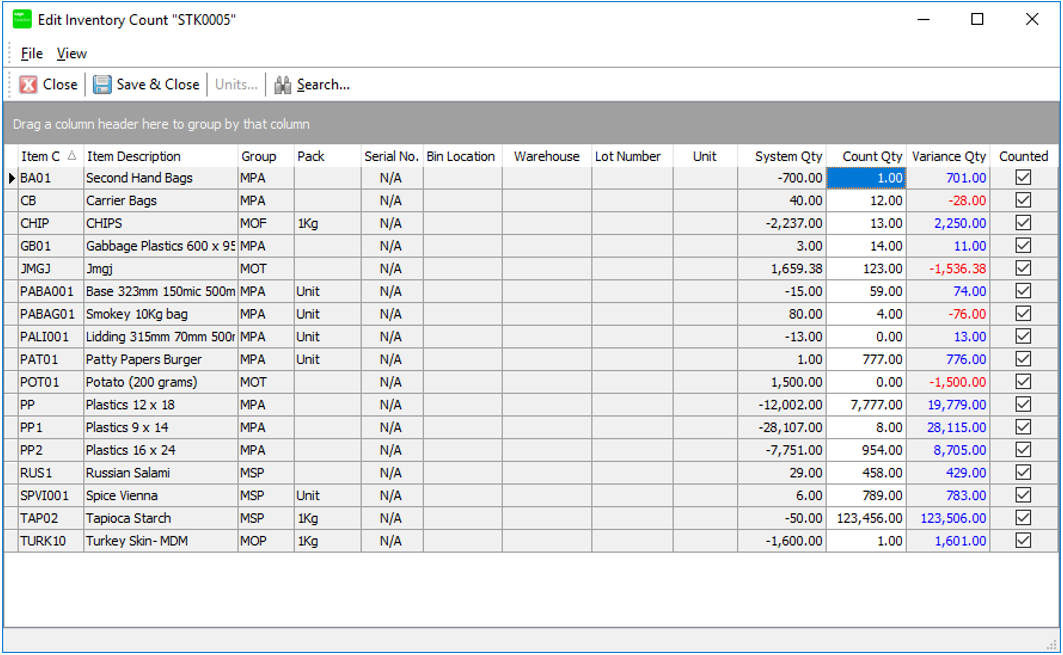 When you have finished all the items, the apply button will turn grey. Press the “Close” button to go back to the count overview page. Here you still have the option to “Edit quantities”. Pressing this button will open the inventory count again, giving you the option to re-enter the counted quantities in the “Count Qty” column. Hit “Save & Close” when ready. See image below.