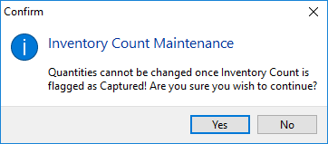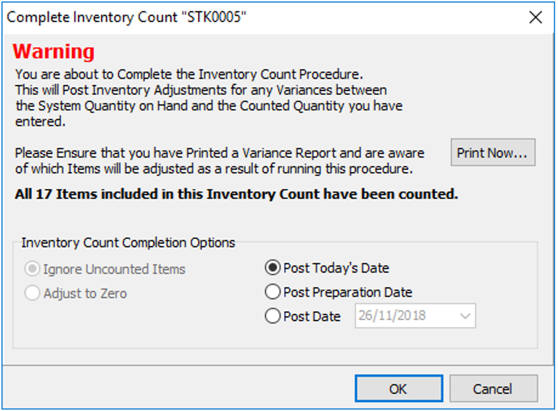 The final step now is to finish the inventory count by clicking on the “Complete” button. The following warning message will be displayed. Choose a post date by clicking on one of the three options to post the inventory count. Note that this will actually update the system quantities!